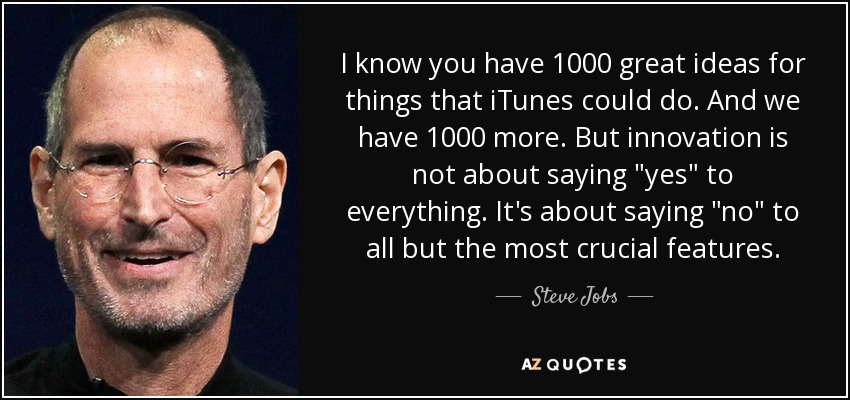 Se que tienes 1000 grandes ideas sobre cosas que iTunes podría hacer. Y nosotros tenemos 1000 más. Pero la innovación no se trata de decirle “si” a todo. Se trata de decir que “no” a todo, excepto a las funcionalidades mas cruciales.