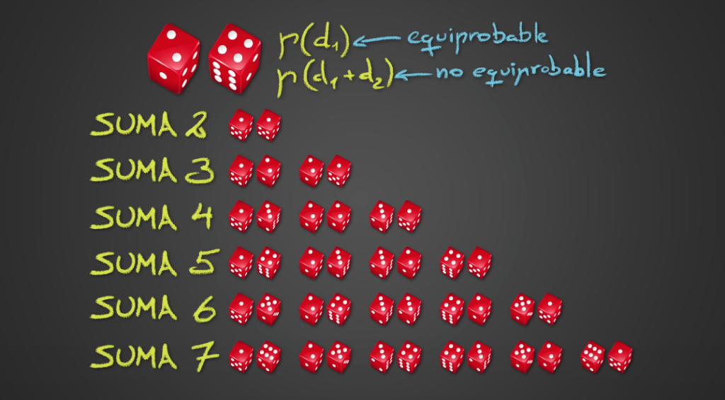 - Por ejemplo: si tenemos un par de dados y vamos a mirar la suma de ambos, los posibles estados del sistema están dados por cada combinación de los dados, así:
